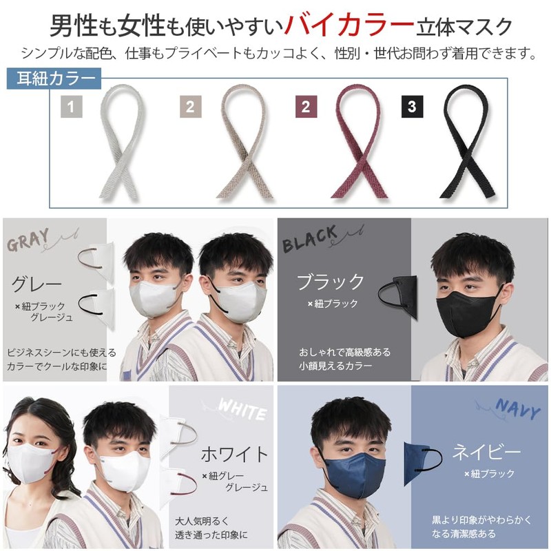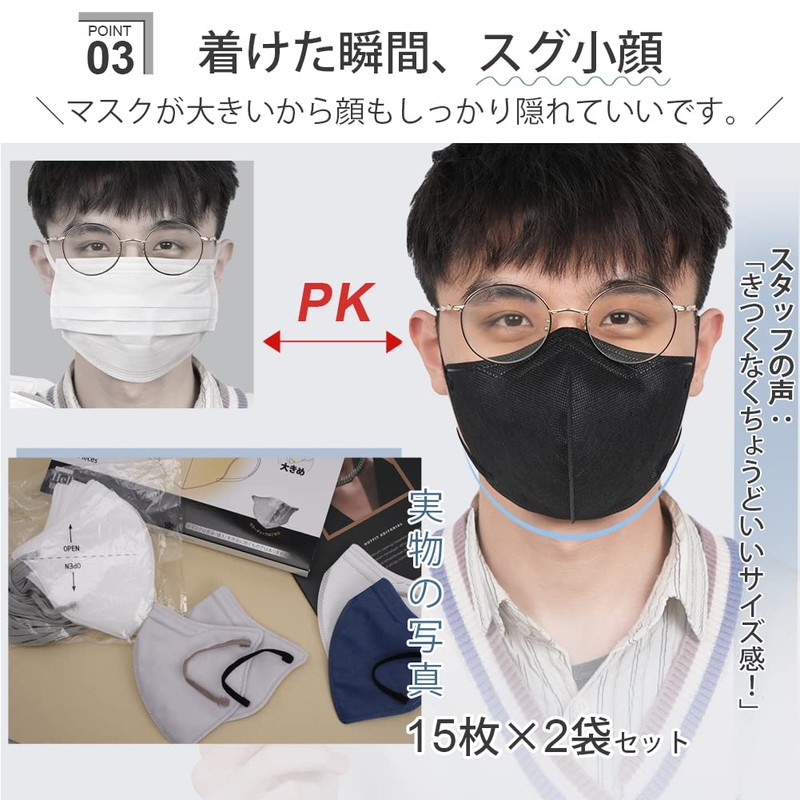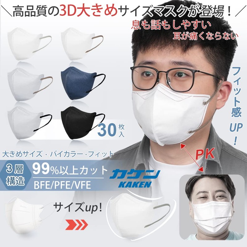 - 【基本情報】商品名:3D FIT MASK(大きめサイズマスク)。色:ブラック/ネービー/グレー/ホワイト。[サイズ]約132mm*150mm。【ご注意①】マスクのデザインにつきまして、全カラーにおいて“マスク内側はホワイト”となっております。予めご了承ください。【ご注意②】本商品は30枚箱入りでございます。箱の中に15枚入の袋が2袋入っております。【ご注意③】中国製、日本国内検品済。KAKEN 99%カット認証済。弊社の商品を長くご愛用頂けますように、ご購入日より一年間のアフターサービスをご提供致します。不良品やご不明な点等があれば、Amazonの購入履歴より、弊社にご連絡ください。