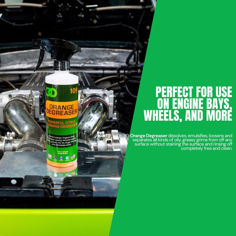 - MULTIPLE USES 3D Orange Degreaser can be used to clean dirt, grease, and grime on plastic, cloth, vinyl, metal, leather, carpet and more!