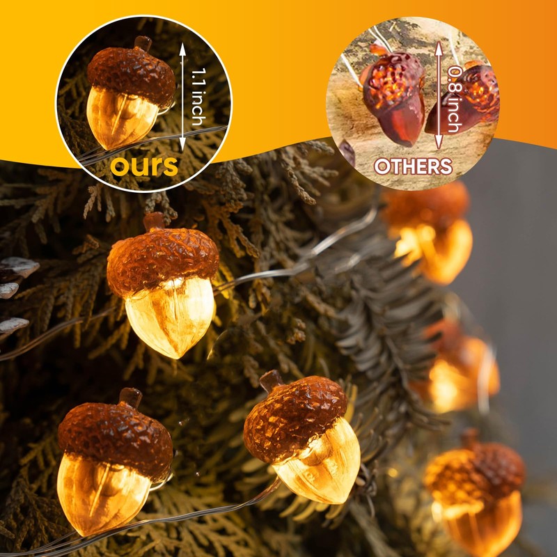 - 【3D Full Size Acorn】30 LED Fall Harvest theme string lights with full size 3d acorn design shapes, great for bedroom, party or festival indoor and covered outdoor decoration. You can hang cute thanksgiving lights anywhere and bring a warm and pleasant atmosphere to your party and family.