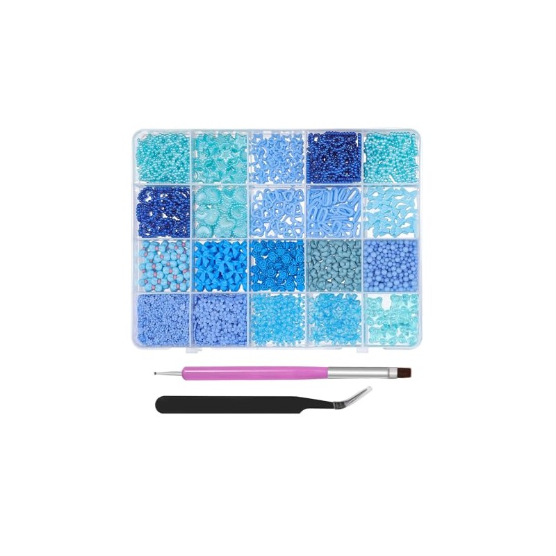 3D Assorted Chunky Nail Charms and Gems Kit, Pearls Bows Heart Star Cute 3D Flowers Rose Bear Macaron Round Beads Embellishments for Nail Art, Craft with Tweezer and Pickup Brush (9-20 Grids-Blue)