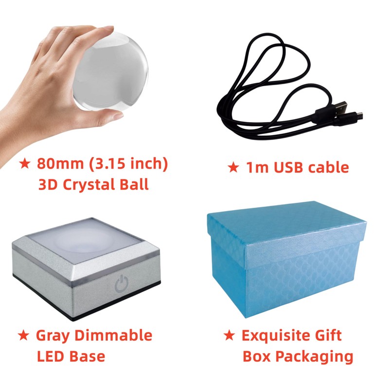 - 🌹【3.15 Inch Crystal Ball】The diameter of the crystal ball is 3.15 inch(8cm). The weight is about 0.65kg (1.43 pounds).Equipped with a gray LED touching base, the crystal ball can be stably placed on the base.You can put it on your bedside table, desk, office, coffee table, etc. Decorate your room,make the night no longer dark.