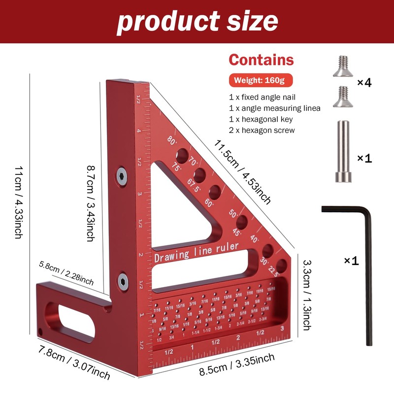 - Multifunctional: this high-precision triangular protractor made of aluminium alloy has preset angles from 22.5° to 90° and corresponding Φ1/4 angle pins for easy and accurate angle drawing;