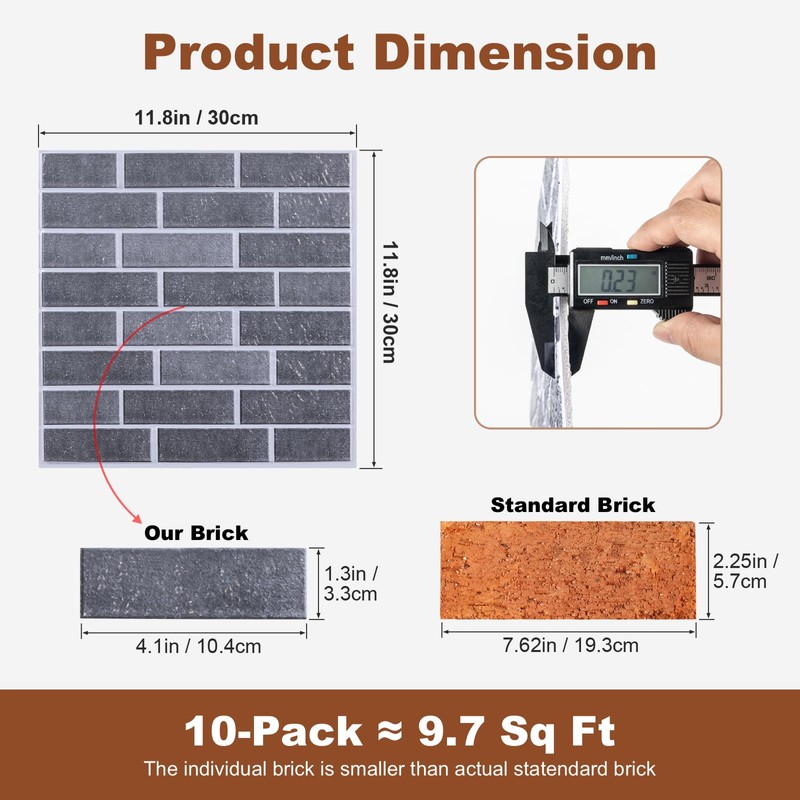 - 🔥1.【Bold 3D Gray Brick Look】 Made of thick 0.23"/6 mm gray PVC foam with carved grooves for a striking 3D faux brick effect. Each tile (11.8"x11.8") has individual bricks sized 4.8" x 1.7"—ideal for modern accent walls.