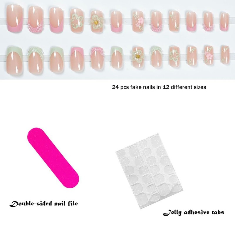 - PACKAGE INCLUDES: 24 pieces square press on nails, 1 double sided nail file, 24 jelly glues. Glossy flower pressed nails come in 24 different sizes/12 sets, suitable for most people's finger size.