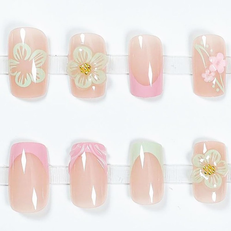 3D Flower Press on Nails False Nails Medium Square Coffin Fake Nails Spring Floral French Tip Acrylic DIY Full Cover Artificial Manicure 24 Pcs