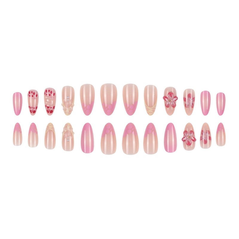 - Enhance your manicure with these stunning medium almond press on nails, featuring intricate 3D flower designs accented with sparkling rhinestones. Perfect for weddings, parties, or special occasions, these fake nails combine dimensional beauty with dazzling elegance for a show-stopping look.