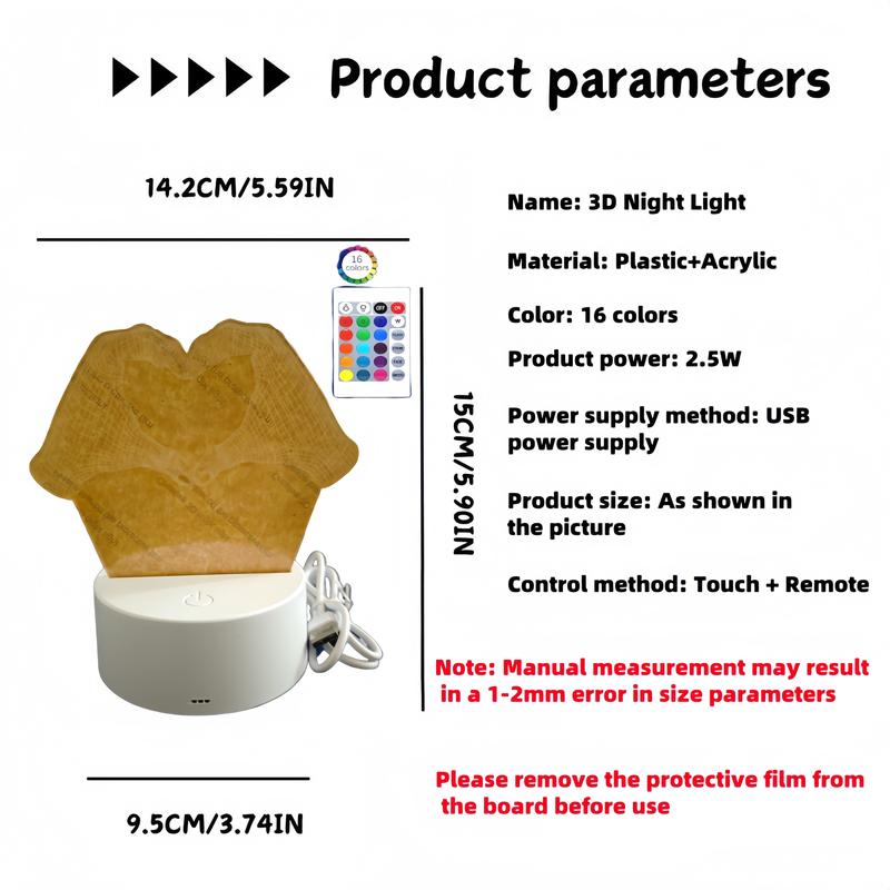 Illuminate your space with love and warmth using this 3D Heart-Shaped Hand Night Light! Featuring an enchanting optical illusion design, this LED lamp is a perfect decorative piece for any room and a thoughtful gift for special occasions.