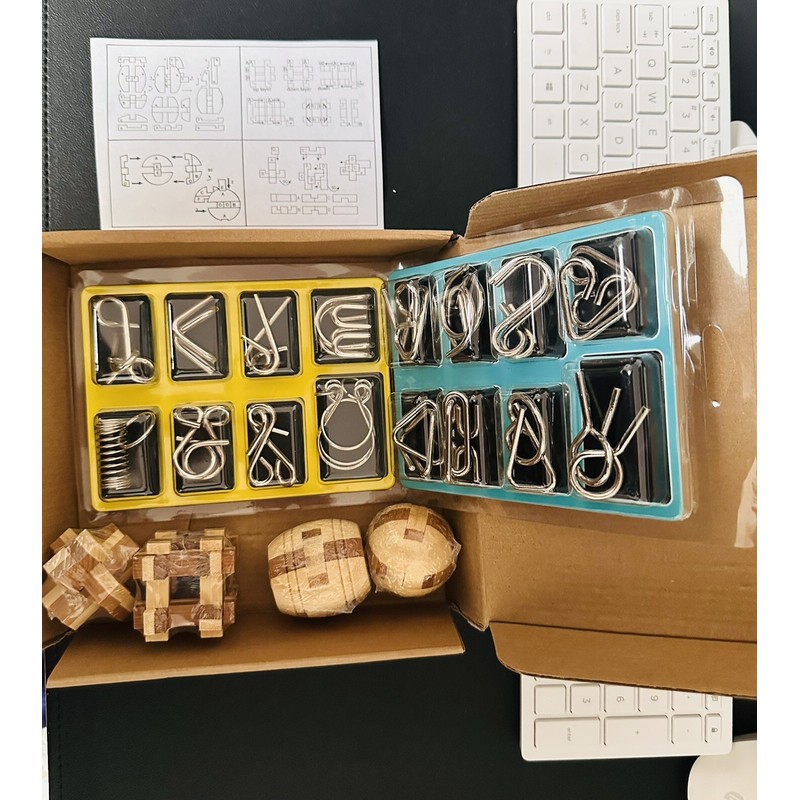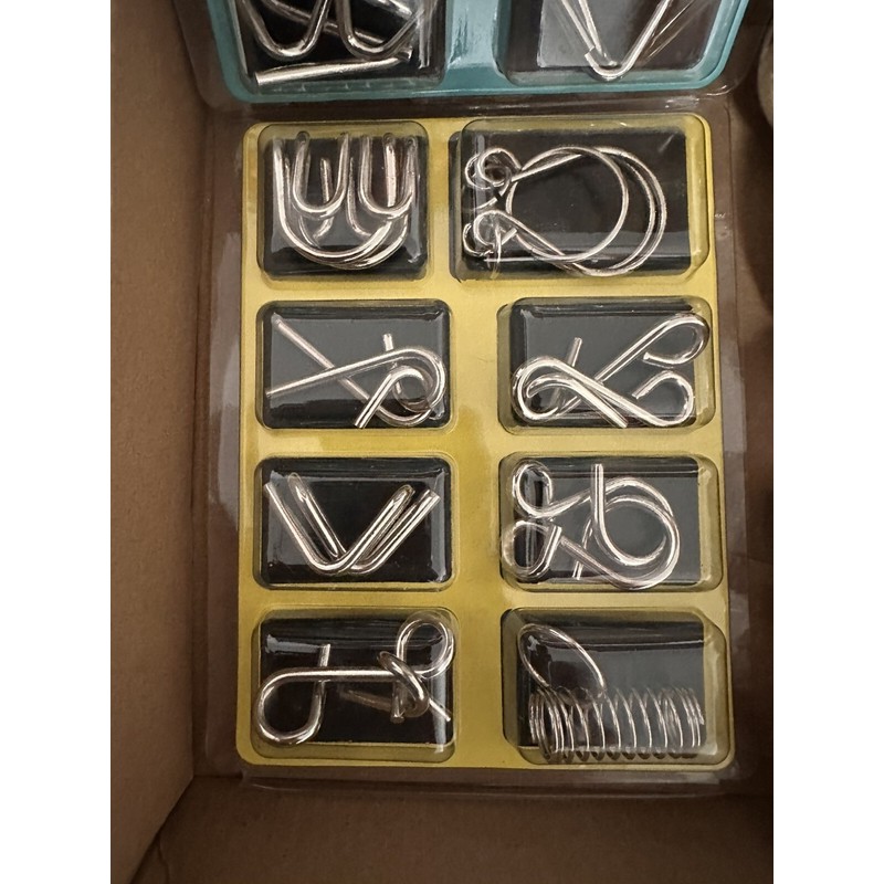 • 16 metal wire puzzles with unique and challenging designs.