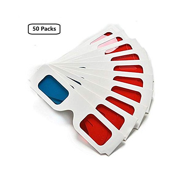 3D Paper Glasses, Red and Cyan Anaglyph, White Cardboard Frame, 50 Pairs