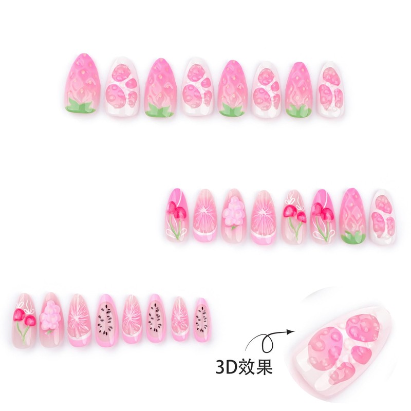 3D Press on Nails Medium Almond with Pink Strawberry Design, White Paw Print Fruite Nail Press ons Glossy Glue on Nails for Women Reusable with Kit, Stick on Cute Fake Nail with Designs Perfectly Fit