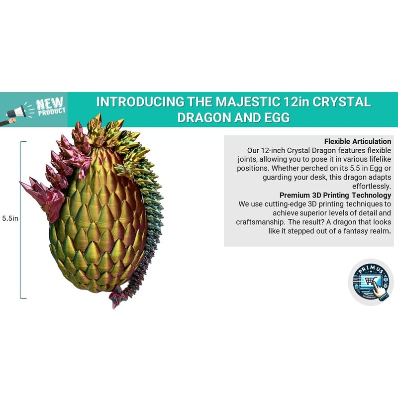 3D Printed 12in Crystal Dragon and Dragon Egg Model Kit Autism Relief, Sensory Toy - Made in USA by Primus (Red Yellow Green)