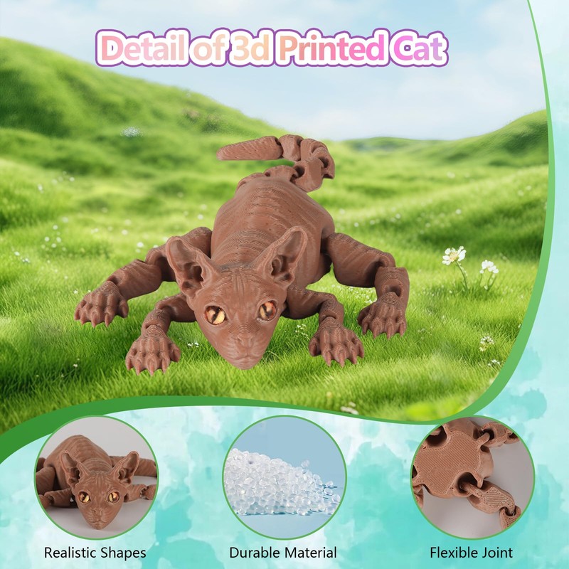 - 3D Printed Cat Toy: Each 3d-printed animal Sphynx Cat(9inches) features movable joints and lifelike details, suitable for 3D printed animals lover collector. Perfect as creative party favors, educational tools, or whimsical desk decor.