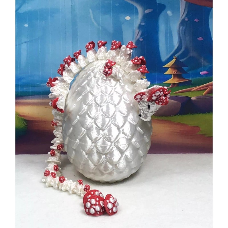 3D Printed enchanting Articulated Mushroom Dragon with dragon egg- a mystical creature that brings a touch of fantasy to your world. Unveil the mystery of White and Red Mushroom Dragon ( measures approximately 12" long) a captivating fusion of elegance and fantasy. This dragon reveals itself with a symphony of colors - a testament to its magical heritage.