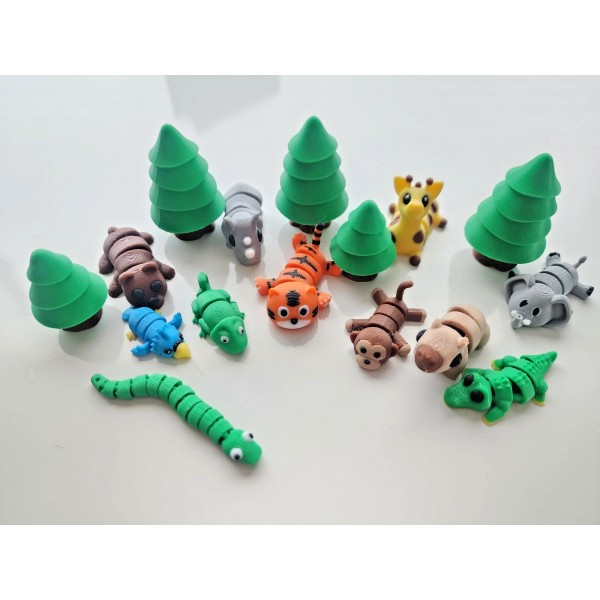 Bring the magic of the jungle to your home or office with this charming set of miniature jungle animals and trees! Each figure is 3D printed with high-quality PLA plastic, featuring articulated joints where applicable for added realism and fun.