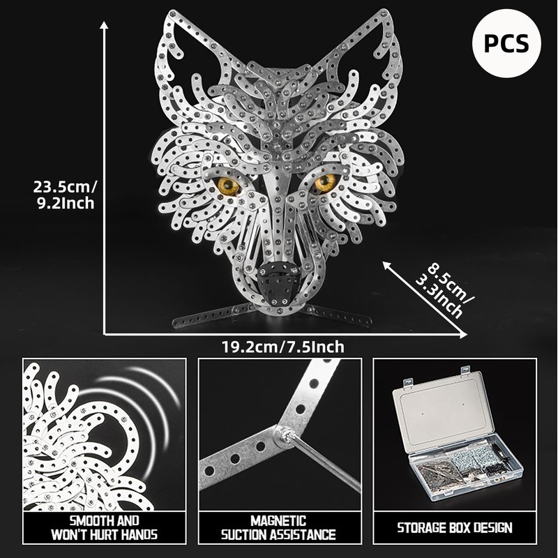 • [Exquisite Desktop Artwork] It is composed of 679pcs of cut metal puzzle. After assembly, it presents a cool steel wolf head shape and can be displayed as a desktop artwork.