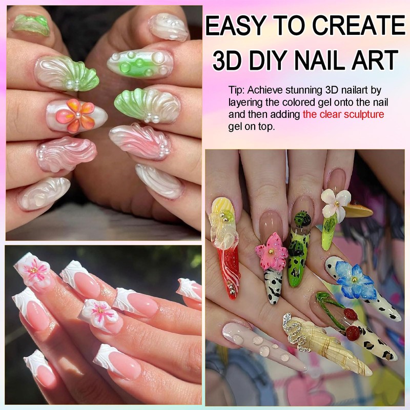 - 【Multifunction Sculpting Gel】This item contains 2*10g(0.66oz) Clear Tube Gel which sutable for nail beginer. YEPYEPGO 3d Nail Art Gel can not only use for sculpting, building, and creating mesmerizing 3D designs but also use as nail charms rhinestone glue.