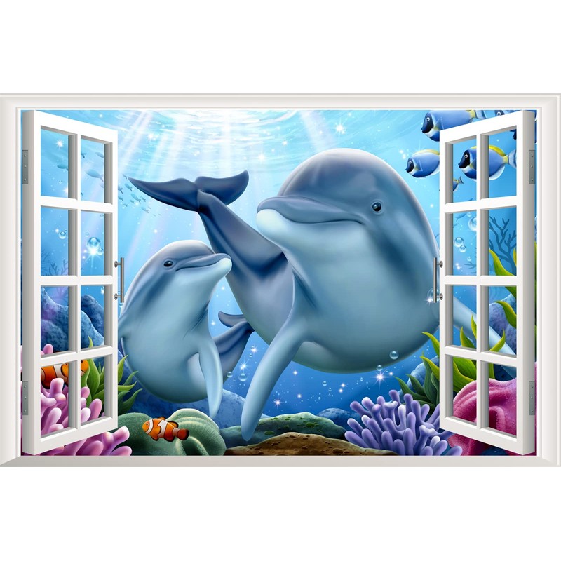 3D Sea World Fake Window Sticker, Dolphin Sea Turtle Tropical Fish Sea Life Wall Decals, Peel and Stick Removable Window Decoration, Boys and Girls Bedroom Living Room Wall Decor,23.6”×35.4''