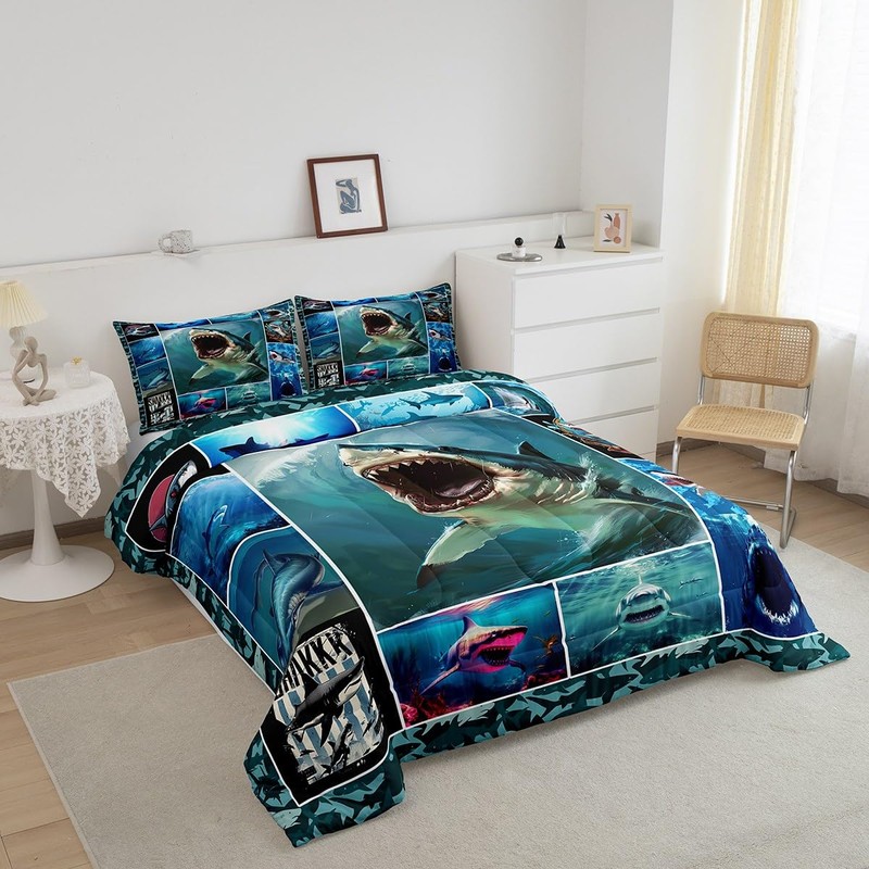 3D Shark Full Size Comforter Set,Sea Animals Bedding Set for Adults Teens,Children Shark Geometric Comforter Luxury Grid Squares Quilt Set Room Decor 3Pcs