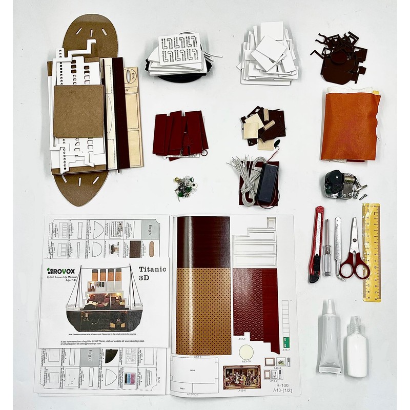 - EVERYTHING'S INCLUDED: The Rovox 3D Titanic models for adults to build comes ready to built with everything included, Includes 20 different type of materials, 5 types of wood, includes LED lights and music box, 2 bottles of glue, scissors, razor, tweezer, ruler and screwdriver