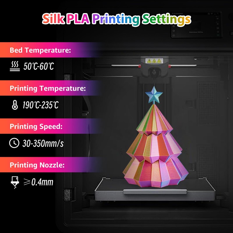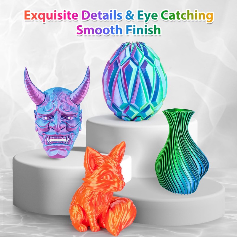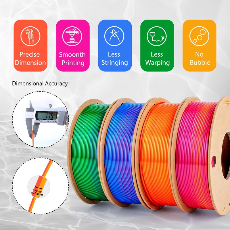 • 250G X 4 COLORS PACK: Comes with 4 different colors(dark blue green, rose red sky blue, gold red orange, rose red yellow sky blue), you can create your 3d world with this silk multicolor PLA filament pack. Each color weighs 250g, providing a total of 1kg.