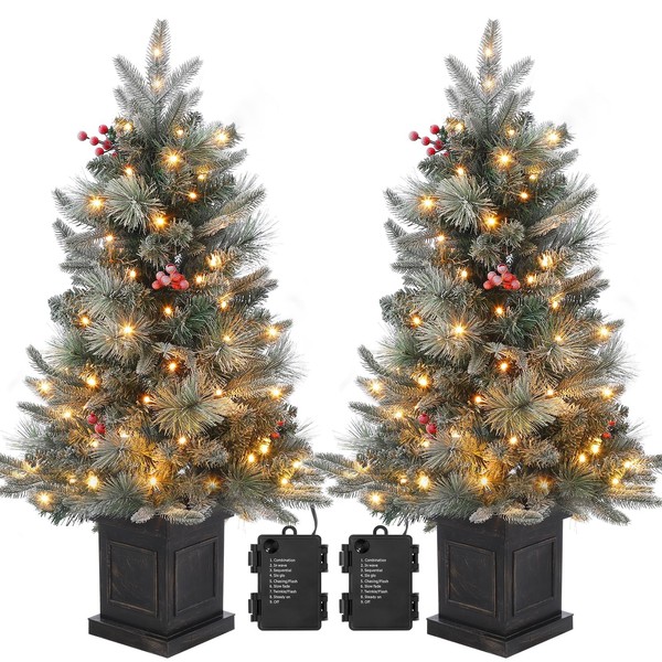 3ft Christmas Tree, Pre-Lit Artificial Christmas Tree with 78 Led Lights, Snowflakes and Red Berries, Xmas Tree with Black Square Base for Bedroom, Living Room, Office, Outdoors