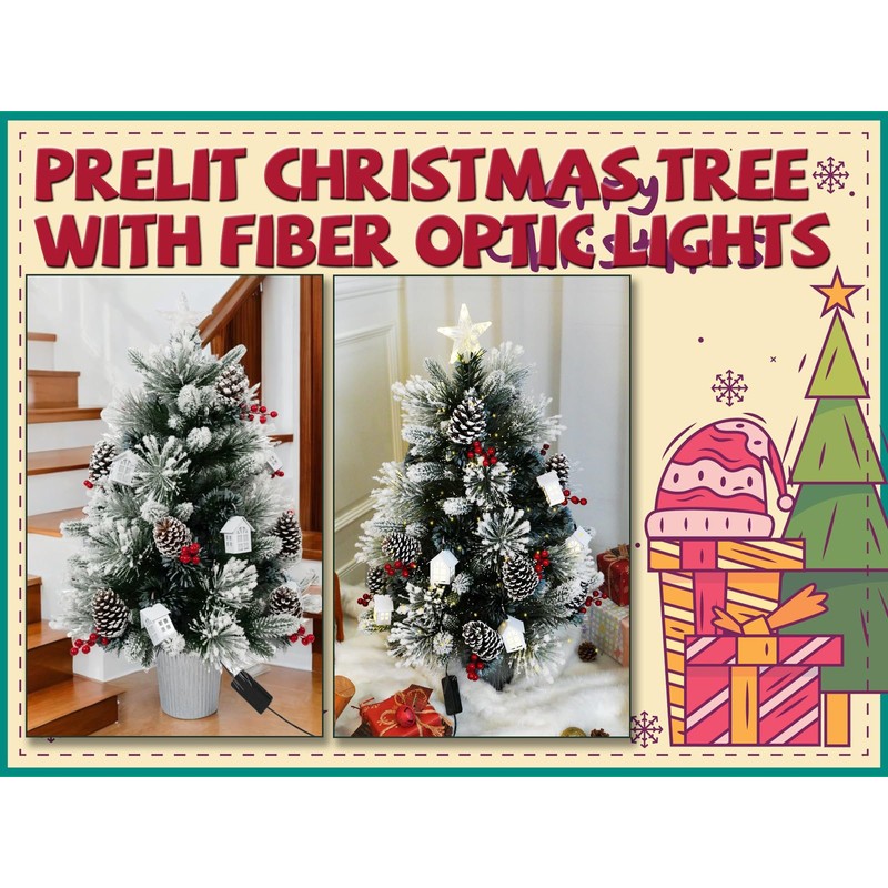 - 2024 NEW PRELIT CHRISTMAS TREE : This pre-decorated 3ft Christmas tree prelit is a new model for 2024, featuring a novel and unique design. The long, short, thick, and thin branches made of three different materials are interwoven, the branches are also adorned with flocking, which makes the tree look even more beautiful and lush. it not only has optical fibers added to each branch but also features a top star, pinecones, and eye-catching white houses, more intense holiday atmosphere