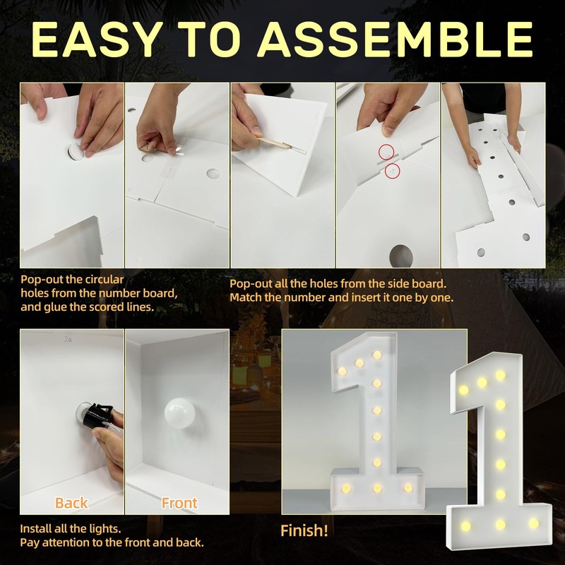 - Package Included: Large lighted numbers kit includes pre-cut marquee foam boards, a string of bulbs with warm lights, transparent stickers, and instructions with a QR code linking to an assembly video (3 AA batteries not included).