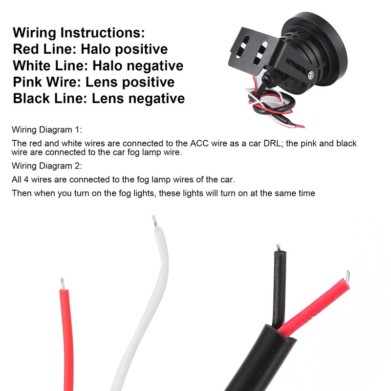 The red and white wires are connected to the ACC wire as a car DRL; the pink and black wire are connected to the car fog lamp wire.