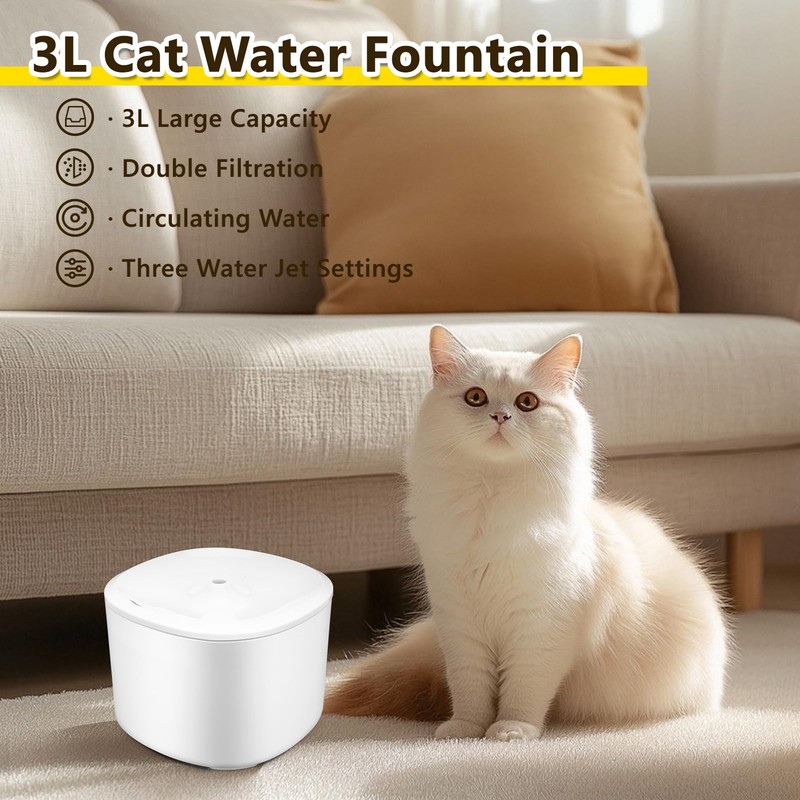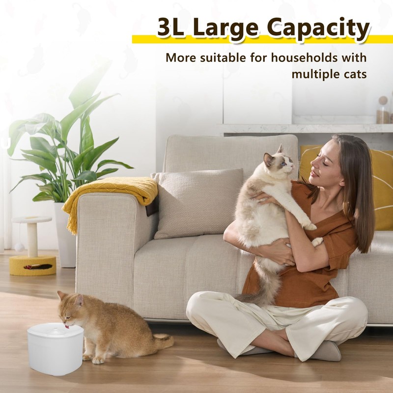 - LARGE 3L CAPACITY DESIGN: Equipped with a 3L large capacity, the cat water fountain provides sufficient drinking water for one or more pets, reducing the frequency of refilling. Combined with a circulation filtration system, it continuously provides fresh water, keeping pets healthy and well-hydrated.