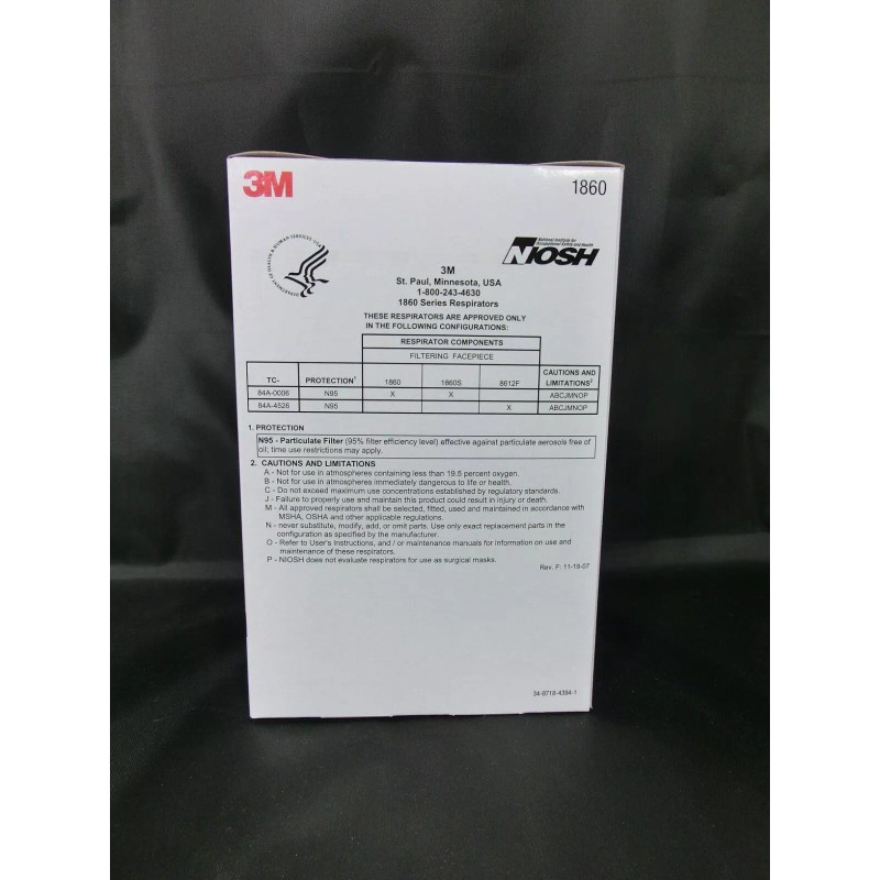 - SpecificationsAerosol TypeNon-OilBraided Comfort StrapYesBrand3M™Cartridge or Filter IncludedYesCase Quantity6 Boxes of 20 each (Total 120 each per Case) SOLD BOX ONLYClassMarket LeaderExhalation ValveNoFaceseal/NosefoamNosefoamFDA ClearedYesFeaturesAdvanced Electrostatic MediaFilter ClassN95Flame Resistance (ASTM D2859-96)NoFlammability RatingClass 1Fluid Resistance120mm HgFluid Resistant (ASTM F1862)YesGas & Vapor Protection TypeParticulatesHazard TypeMold, SilicaIndividually WrappedNoMarketAerospace, Defense, Homeland SecurityModel1860National Stock Number6532014225282Natural Rubber Latex ComponentsNoPackaging20 each per BoxProduct ColorTealProduct TypeHealthcare RespiratorProtection LevelN95PurposeHealthcare RespiratorRecommended ApplicationAgricultural Production, Airborne Biological Particles, Bagging, Dry Chemical Handling, Emergency & Pandemic Preparedness, Foundry Operations, Grinding, Petrochemical Manufacturing, Processing of Minerals, Sanding, Textile OperationsRecommended IndustryHealth CareRespirator SizeStandardRespirator StyleCupSegmentPersonal SafetySizeStandardSpecifications MetN95 & FDA ClearedStrap Attachment TypeBraided Comfort Strap