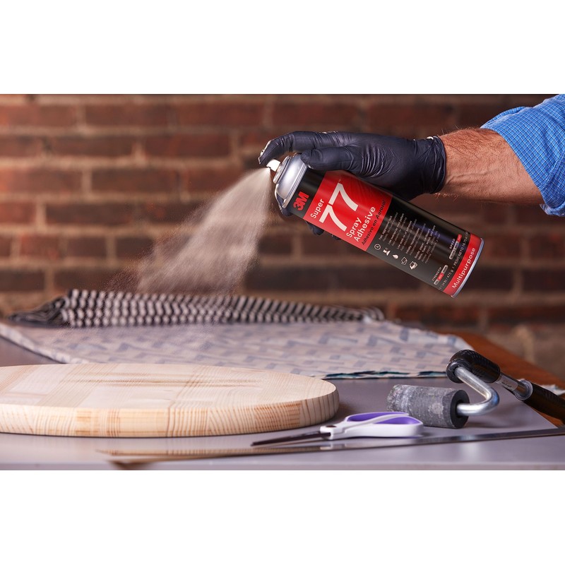 For more than 50 years, 3M Super 77 Industrial Grade Multipurpose Spray Adhesive Glue has remained a staple in 3M's portfolio of go-to, everyday-use adhesives considered by many to be necessary at the factory. Recognized worldwide, this spray adhesive has demonstrated its reliability in countless applications. For many, "getting the job done" is just a spray away. 3M Super 77 Multipurpose Spray Adhesive to be an extremely versatile, fast-drying spray adhesive that bonds a wide range of lightweight materials. Our permanent bond provides fast results to keep projects moving ahead. The photo-safe spray formula is easy to dispense and apply directly onto surfaces and materials where needed, with low soak-in or yellowing over time. It has an aggressive tack that offers a high initial grab as well as sufficient open time to position materials properly. High-solids content supports its low soak-in property, giving you time to find the best fit for your parts. This attribute also provides higher coverage than competing spray adhesives and helps create soft, non-dimpling glue lines. The combination of fast tack, strong bond and clean appearance make it ideal for projects of all kinds. Typical applications include general assembly, maintenance and repair projects; temporary holding; attaching fiberglass insulation and drywall corner beads; bonding thin films, foils and fabrics; picture framing and mounting displays; crafts and hobbies; installing acoustic panels in home studios; palletizing and label attachment.