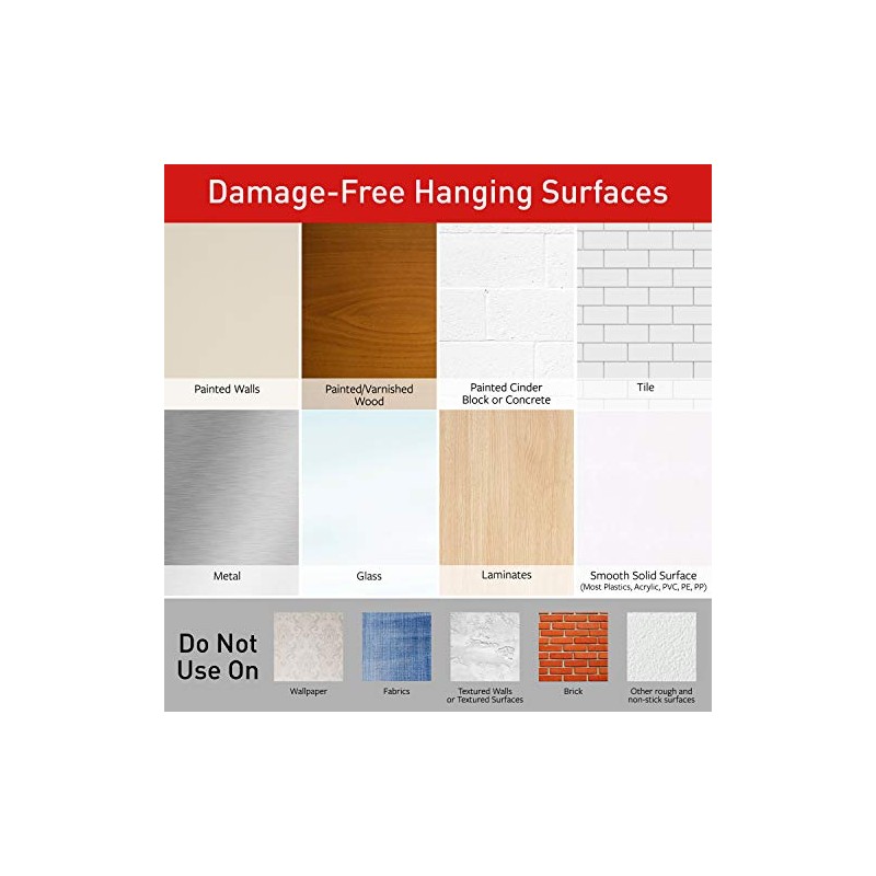 - DAMAGE FREE HANGING: Damage free hanging strips work without leaving holes, marks or sticky residue on a variety of surfaces and remove cleanly when you want to redecorate or reorganize your space without tools