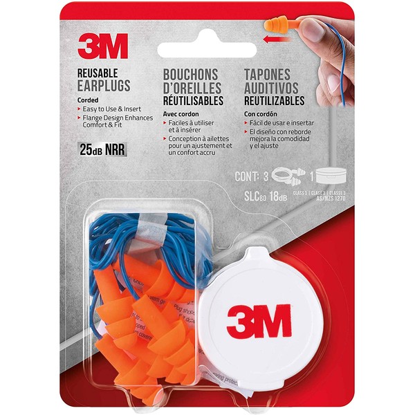 3M Corded Reusable Earplugs, 3-Pair with Case (90716-80025T)