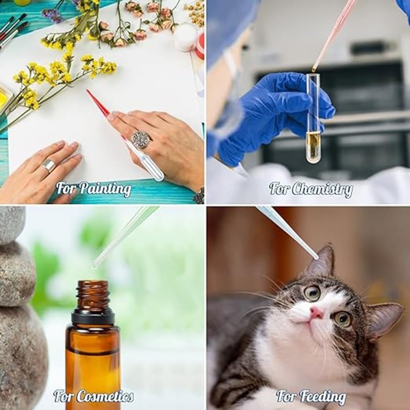 3. Widely Applications:These pipettes can be used for essential oils, cosmetics, candle making, pet/animal feed/dosage, micro measurement, etc.Great for transferring and dispensing liqui-d such as water, oil, Essential Oils, Makeup, solution in kitchen, home, Lab.