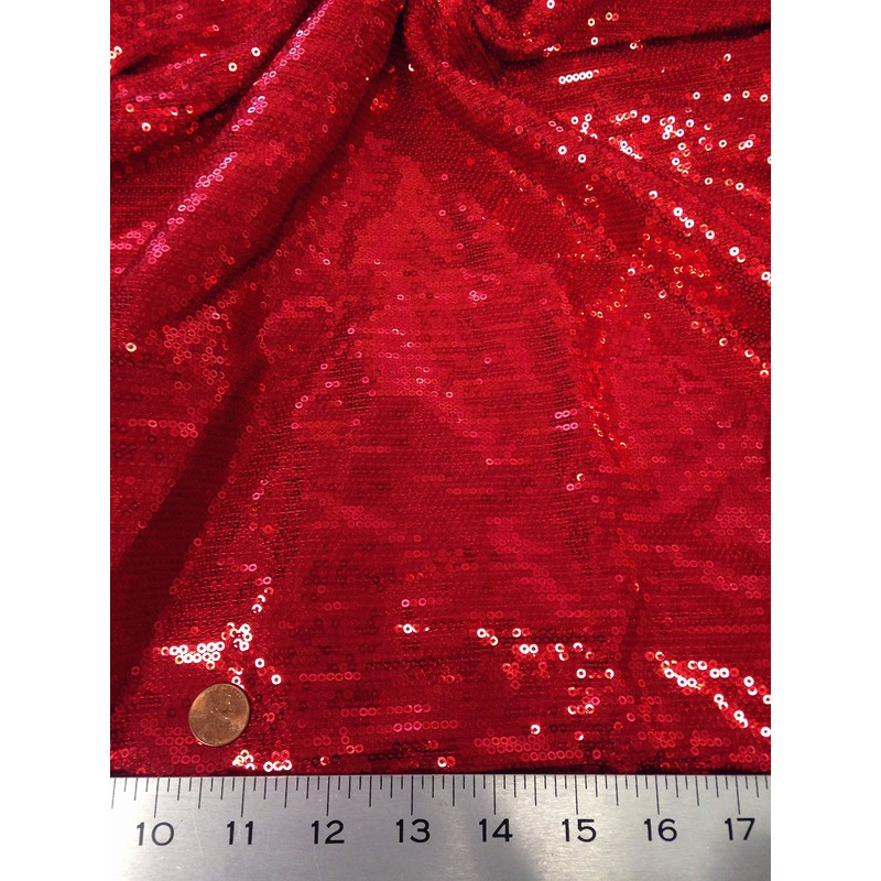 3mm Shiny Sequins, 95% Polyester 5% Spandex , FDY (Fully Drawn Yarn) Fabric, base fabric is 56 to 58 Inches Wide, Sequins are on 50 to 52 Inches of Width, 2-Way Stretch. The fabric will be cut as one continuous piece no matter the yardage you order. *Due to the lighting when taking the photos and differences in screen resolutions, the color shade of the fabric might not be exact when you receive it. *Sequin size is the same for all colors. Please refer to photos where a ruler and/or Penny is included for size refernce. *The ruler in photos is in inches (in).