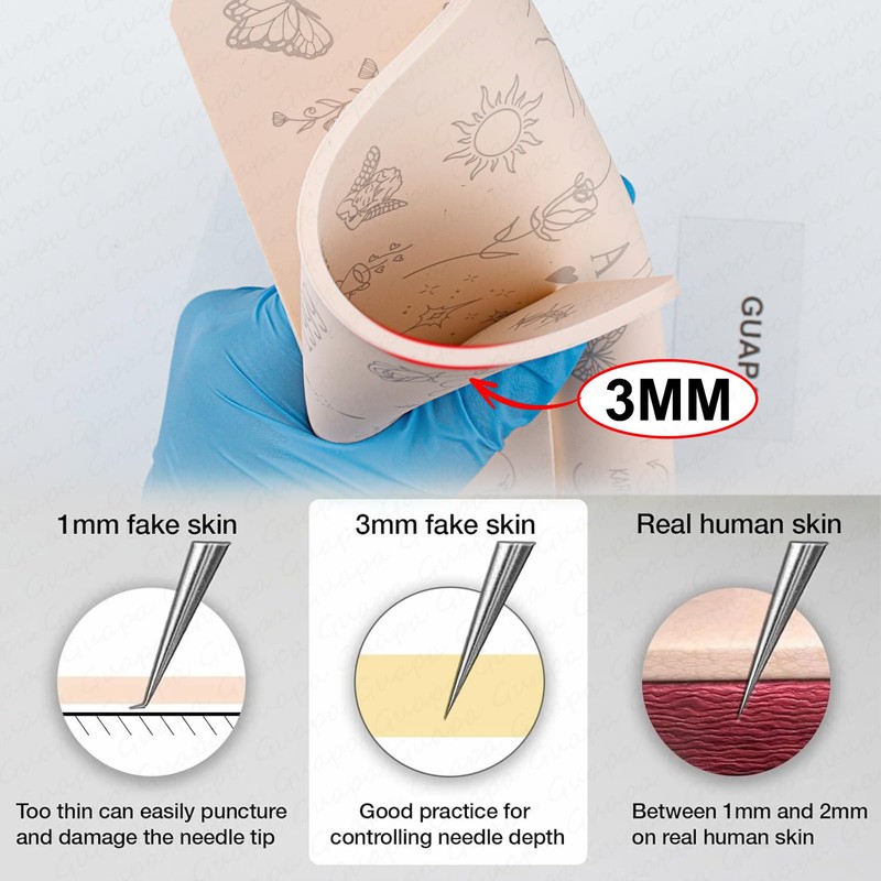 - 3MM Tiny Tattoo Practice skin Made from high-quality materials, it is closely mimic the texture and feel of real human skin. This gives you a realistic experience, allowing you to refine your skills before working on actual clients.