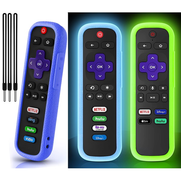 3Pack Case for Roku Remote, Remote Cover for Roku Voice Remote/Hisense/TCL Roku TV Steaming Stick, Silicone Universal Protective Controller Sleeve for Roku TV Remote with Lanyards Glow Green Blue
