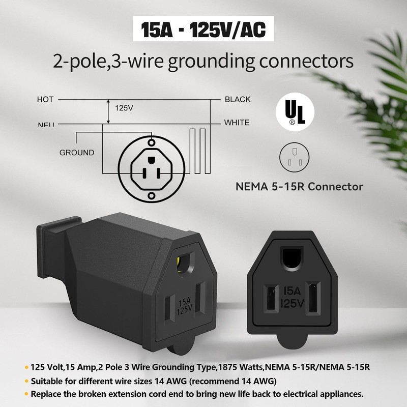 - 【NEMA 5-15R Plug】- Female Replacement Plug (3 PCS),125 Volt, 15 Amp, 2 Pole 3 Wire Grounding Type, 1875 Watts. for 3-pin US plug DIY assembly.