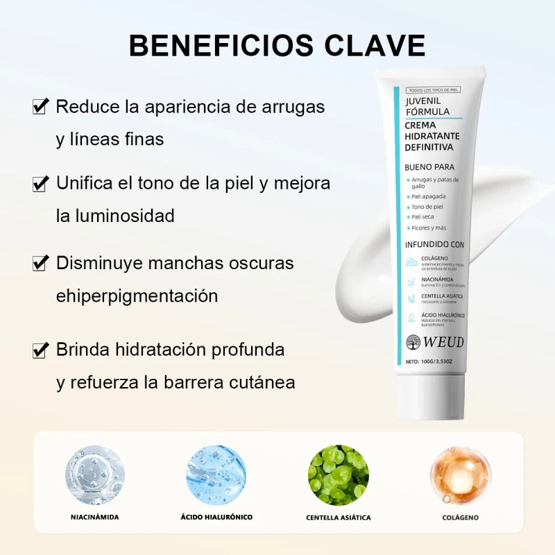 - Weud Crema Hidratante Definitiva Youth Formula (100g/3.53oz) Ingredientes Clave y Beneficios: 1.Colágeno Hidrolizado:Ayuda a mejorar la elasticidad de la piel y su firmeza. 2.Niacinamida: Contribuye a optimizar la textura cutánea. 3.Extracto de Centella Asiática: Proporciona unaexperiencia calmante y reparadora. 4.Acido Hialurónico:Potencia la capacidad de hidratación de la piel. Caracteristicas del Producto: 1.Textura: Crema ligera deabsorción r¡pida sin residuos grasos. 2.Tamao: 100g/3.53oz. 3.Recomendado para: Cuidado diario de múltiples tipos de piel. 4.Instrucciones de Uso: Aplicar una cantidad adecuada demanera uniforme sobre el rostro y cuello después de lalimpieza matutina y nocturna.