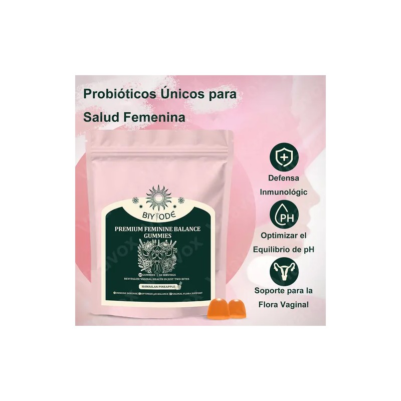 Cada bolsa contiene 60 gomitas veganas, sin gluten, halal y bajas en calorías, elaboradas con polvo de fruta de piña y coagulanos de bacilo para brindar un apoyo integral a la salud femenina. Nuestro compromiso con la calidad y tus valores nutricionales se refleja en esta fórmula sin azúcar, que combina los beneficios de los suplementos tradicionales en un formato fácil de consumir.