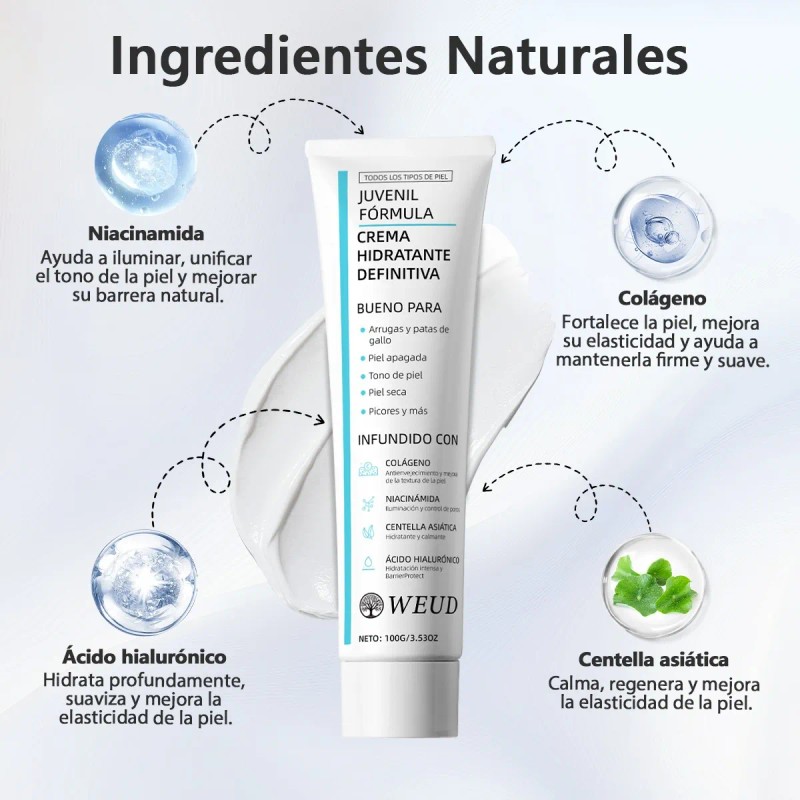 - Weud Crema Hidratante Definitiva Youth Formula (100g/3.53oz) Ingredientes Clave y Beneficios: 1.Colágeno Hidrolizado:Ayuda a mejorar la elasticidad de la piel y su firmeza. 2.Niacinamida: Contribuye a optimizar la textura cutánea. 3.Extracto de Centella Asiática: Proporciona unaexperiencia calmante y reparadora. 4.Acido Hialurónico:Potencia la capacidad de hidratación de la piel. Caracteristicas del Producto: 1.Textura: Crema ligera deabsorción r¡pida sin residuos grasos. 2.Tamao: 100g/3.53oz. 3.Recomendado para: Cuidado diario de múltiples tipos de piel. 4.Instrucciones de Uso: Aplicar una cantidad adecuada demanera uniforme sobre el rostro y cuello después de lalimpieza matutina y nocturna.