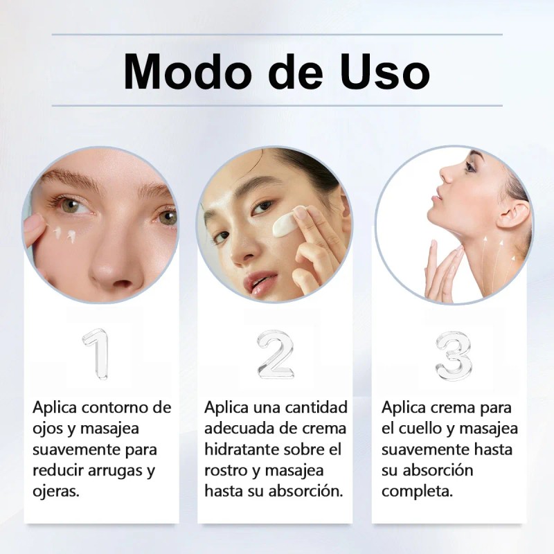 Weud Crema Hidratante Definitiva Youth Formula (100g/3. 53oz) Ingredientes Clave y Beneficios: 1. Colágeno Hidrolizado:Ayuda a mejorar la elasticidad de la piel y su firmeza. Niacinamida: Contribuye a optimizar la textura cutánea. Extracto de Centella Asiática: Proporciona unaexperiencia calmante y reparadora. Acido Hialurónico:Potencia la capacidad de hidratación de la piel. Caracteristicas del Producto: 1. Textura: Crema ligera deabsorción r¡pida sin residuos grasos. Tamao: 100g/3. Recomendado para: Cuidado diario de múltiples tipos de piel. Instrucciones de Uso: Aplicar una cantidad adecuada demanera uniforme sobre el rostro y cuello después de lalimpieza matutina y nocturna. ---------------------------------------------------------------------------------------------------------------- WEUD Crema Ojos Para Antiarrugas y Hidratación y Revitalizantede Piel y Reduce Bolsas (40ml/1. oz) + Reafirma la piel + Mejora la luminosidad + Hidratació y retención de humedad + Favorece la producción de colágeno Ingredientes Clave y Beneficios: Péptidos : Estimulan el colágeno, mejoran la elasticidady reducen arrugas.