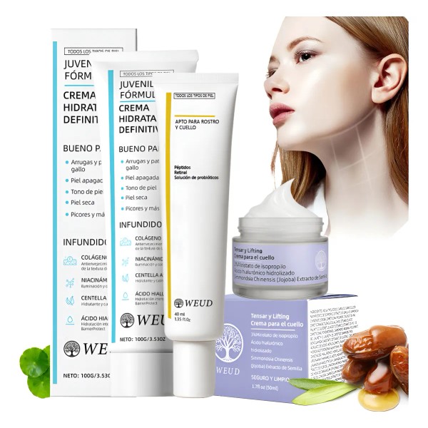 Weud Crema Hidratante Definitiva Youth Formula (100g/3. 53oz) Ingredientes Clave y Beneficios: 1. Colágeno Hidrolizado:Ayuda a mejorar la elasticidad de la piel y su firmeza. Niacinamida: Contribuye a optimizar la textura cutánea. Extracto de Centella Asiática: Proporciona unaexperiencia calmante y reparadora. Acido Hialurónico:Potencia la capacidad de hidratación de la piel. Caracteristicas del Producto: 1. Textura: Crema ligera deabsorción r¡pida sin residuos grasos. Tamao: 100g/3. Recomendado para: Cuidado diario de múltiples tipos de piel. Instrucciones de Uso: Aplicar una cantidad adecuada demanera uniforme sobre el rostro y cuello después de lalimpieza matutina y nocturna. ---------------------------------------------------------------------------------------------------------------- WEUD Crema Ojos Para Antiarrugas y Hidratación y Revitalizantede Piel y Reduce Bolsas (40ml/1. oz) + Reafirma la piel + Mejora la luminosidad + Hidratació y retención de humedad + Favorece la producción de colágeno Ingredientes Clave y Beneficios: Péptidos : Estimulan el colágeno, mejoran la elasticidady reducen arrugas.