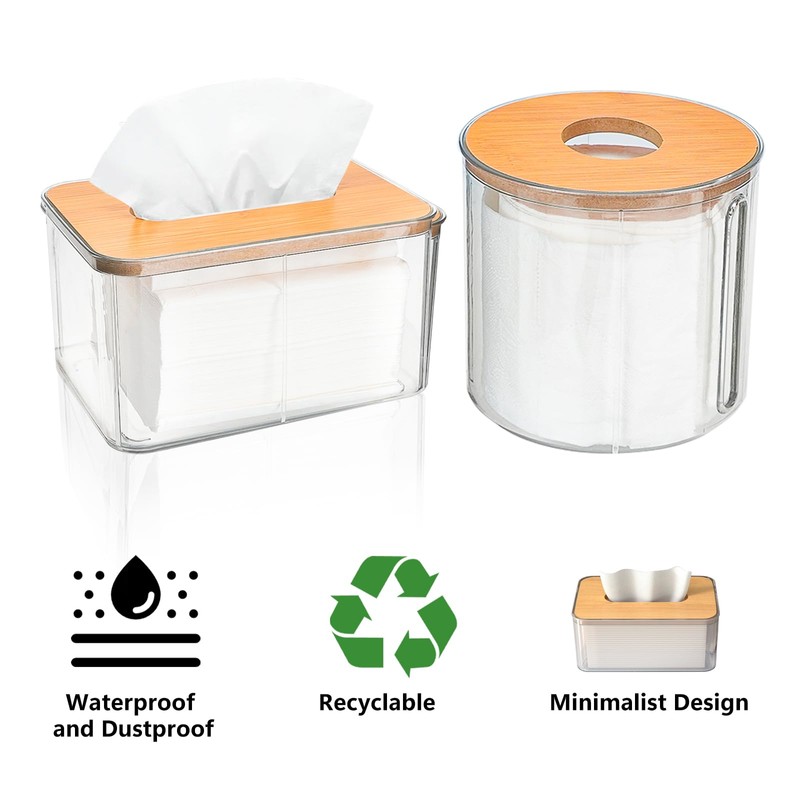 - 【Suitable Size】Rectangular tissue box size is 5.1*3.7*7.1in, round tissue box diameter size is 5.1*5.1in, the right size design can be compatible with a variety of common tissue specifications in the market, whether it is a standard square facial tissue, rectangular drawer paper, or rolling paper and other different forms of paper towels, can be better placed in the tissue box.