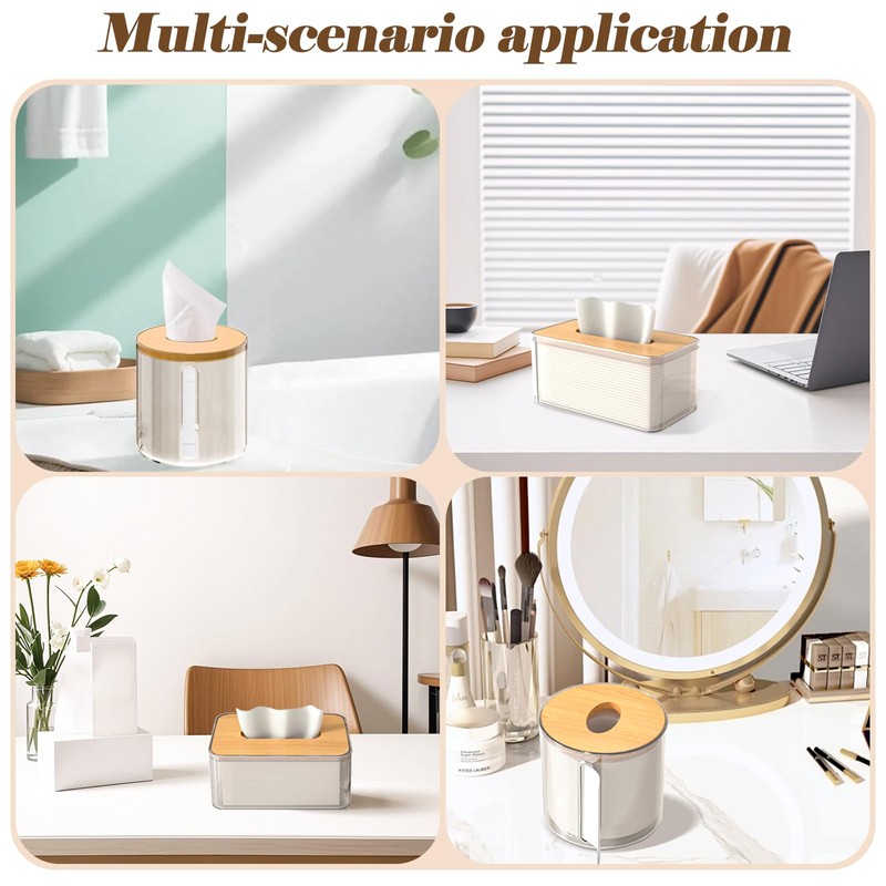 3PCS Acrylic Tissue Box Holder, Clear Tissue Organizer with Bamboo Wood Lid, Rectangular Container for Office, Living Room, Bathroom, Bedroom, Medium Size