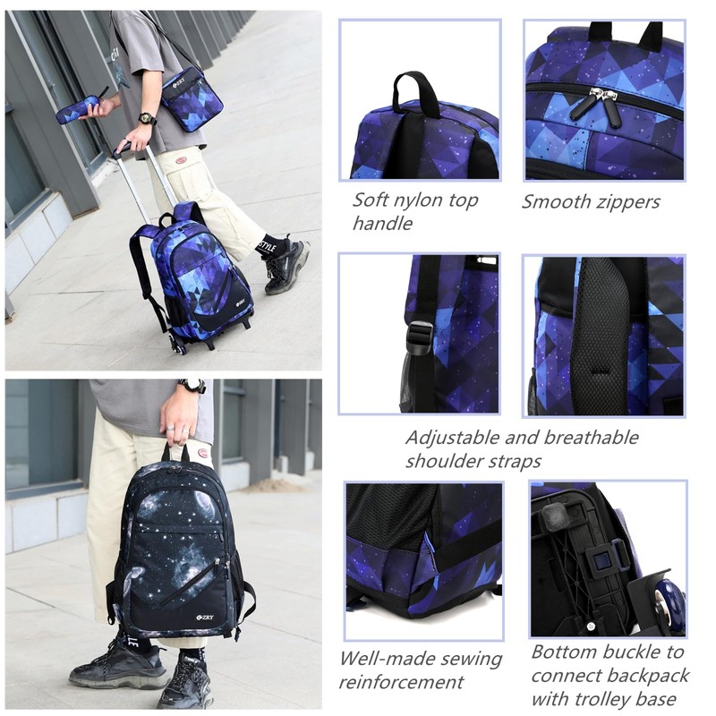 - 【Comfortable and Multi-function】 Widened and thickened S-shaped breathable shoulder straps, padded back panel, and soft nylon handle, providing your child additional comfort; This boys rolling backpack set not only could be used as a trolley carry on backpack, but also a normal boys school backpack.