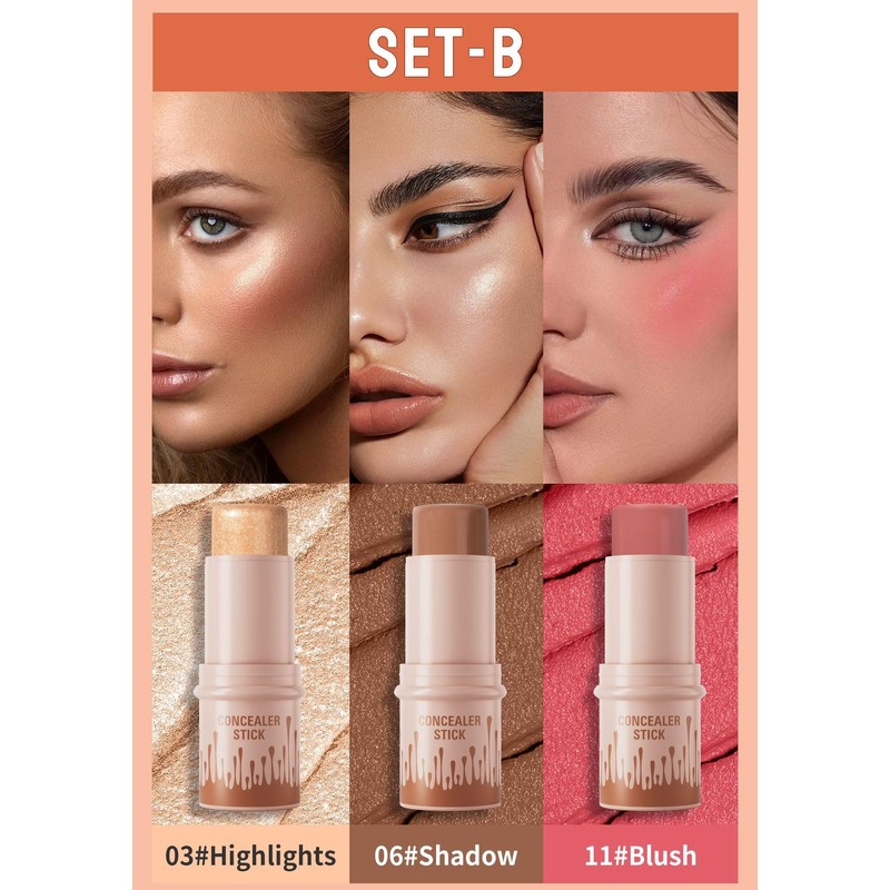 3Pcs Contour Stick Set,3 Colors Contour Stick Makeup Set, Long-Lasting Waterproof Concealer Stick Kit,Cream Blush & Highlighter Bronzer Pen (SET-B)