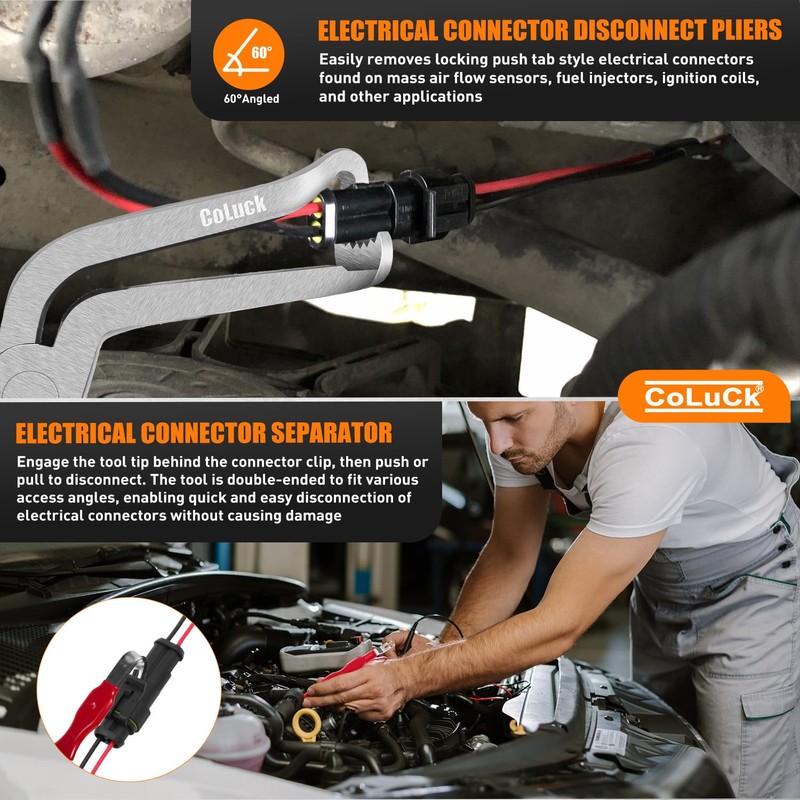 - Electrical Connector Separator Tool -This electrical connector separator tool disconnect electrical connectors on your wiring harnesses without damaging them. Coluck connector separator tool is about 18cm/7.1" long and comes with a no-slip handle and 2 different style angles on the tips to make access easier depending on the electrical connector. Coluck terminal electrical separator tool connector removal tool will work on all Jeeps, SUVs, trucks, and cars of all makes, models, and years.