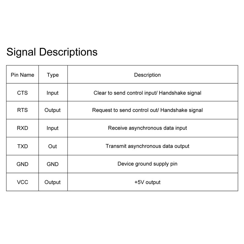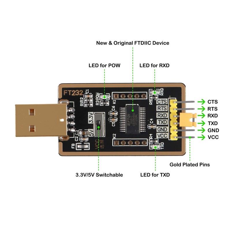 • Provides access to UART Transmit (Tx), Receive (Rx), RTS#, CTS#, VCC and GND connections; POW(power), There are RXD/TXD transceiver communication LEDs to indicate transmission and reception of data.