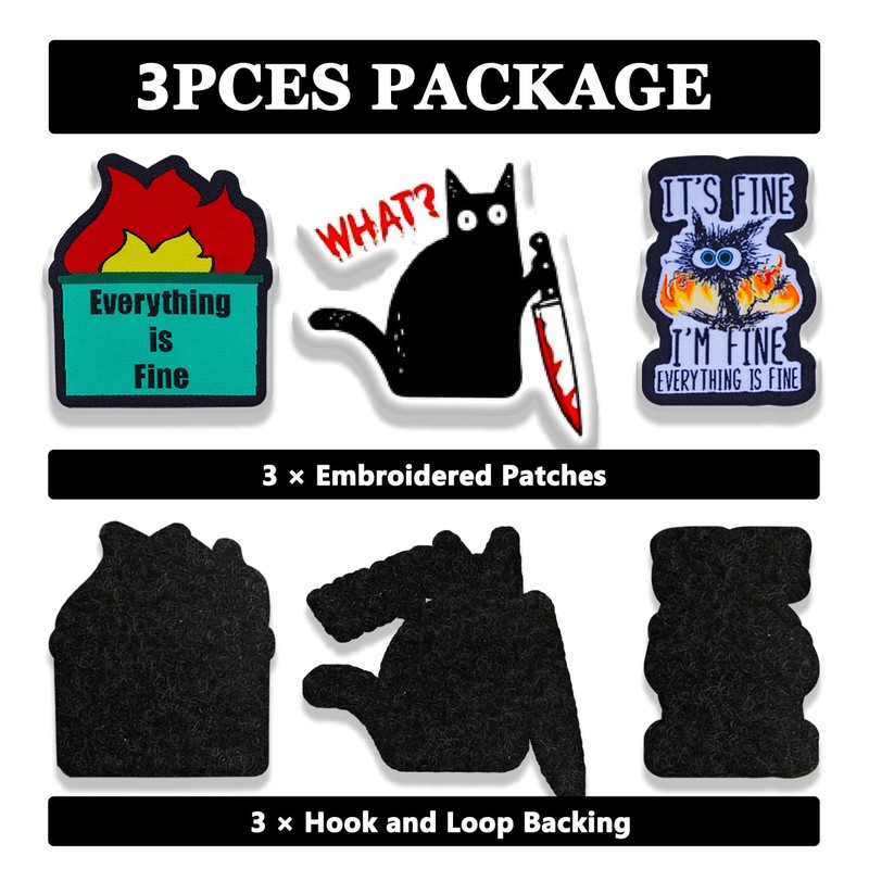 - ★【3Pcs Meme Patches】This morale patch kit includes 3 different patterns, like Everything is Fine & WHAT Cat & I'm Fine, It's Fine, they can meet your diverse needs of daily outfits or costume